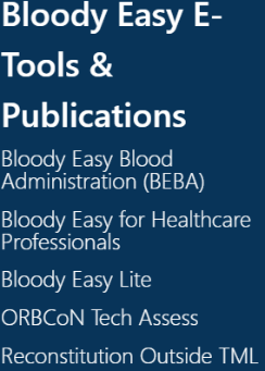 Bloody Easy E-tools & Publications: Register for the E-learning modules such as ORBCoN Tech Assess and upcoming Reconstitution Outside the Transfusion Medicine laboratory (TML). Access flipbooks and PDF handbooks for Bloody Easy Blood Administration (BEBA), Bloody Easy 5.1, and Bloody Easy Coagulation Simplified. Physical copies can be ordered online. Ontario orders are free; out of province orders incur fees. To order the handbooks you will fill out a form and they will be shipped to you.