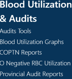 Blood Utilization Graphs & Reports: Find Provincial audit tools like the Bedside Audit of Blood Administration that hospitals can use as part of their quality improvement initiative project. Annual blood utilization information for Ontario can also be found in this section, along with other provincial reports like the Canadian Obstetrical and Perinatal Transfusion Network (COPTN) national survey report and other audit reports conducted in previous years.
