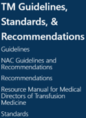 TM Guidelines & Standards: These resources are designed for transfusion medicine leaders, safety officers, and clinical teams to ensure evidence-based care and regulatory compliance. A comprehensive set of resources includes clinical guidelines for blood components and specialty areas, national recommendations from the NAC, and practical tools like bleeding management apps and transfusion safety tips. The page also offers regulatory standards, accreditation guidance, and a detailed resource manual for medical directors to support governance and quality assurance.