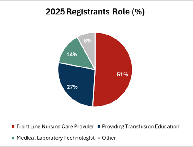 A four-hour virtual educational session was presented on November 26, 2025. Registration to attend was required (for security purposes) however there was no cost to attendees. The 2025 format was modified to include four consecutive sessions; based on attendee feedback and limitations of the available technology, the concurrent session format from previous years was abandoned. The 2025 contemporary transfusion medicine topics included: